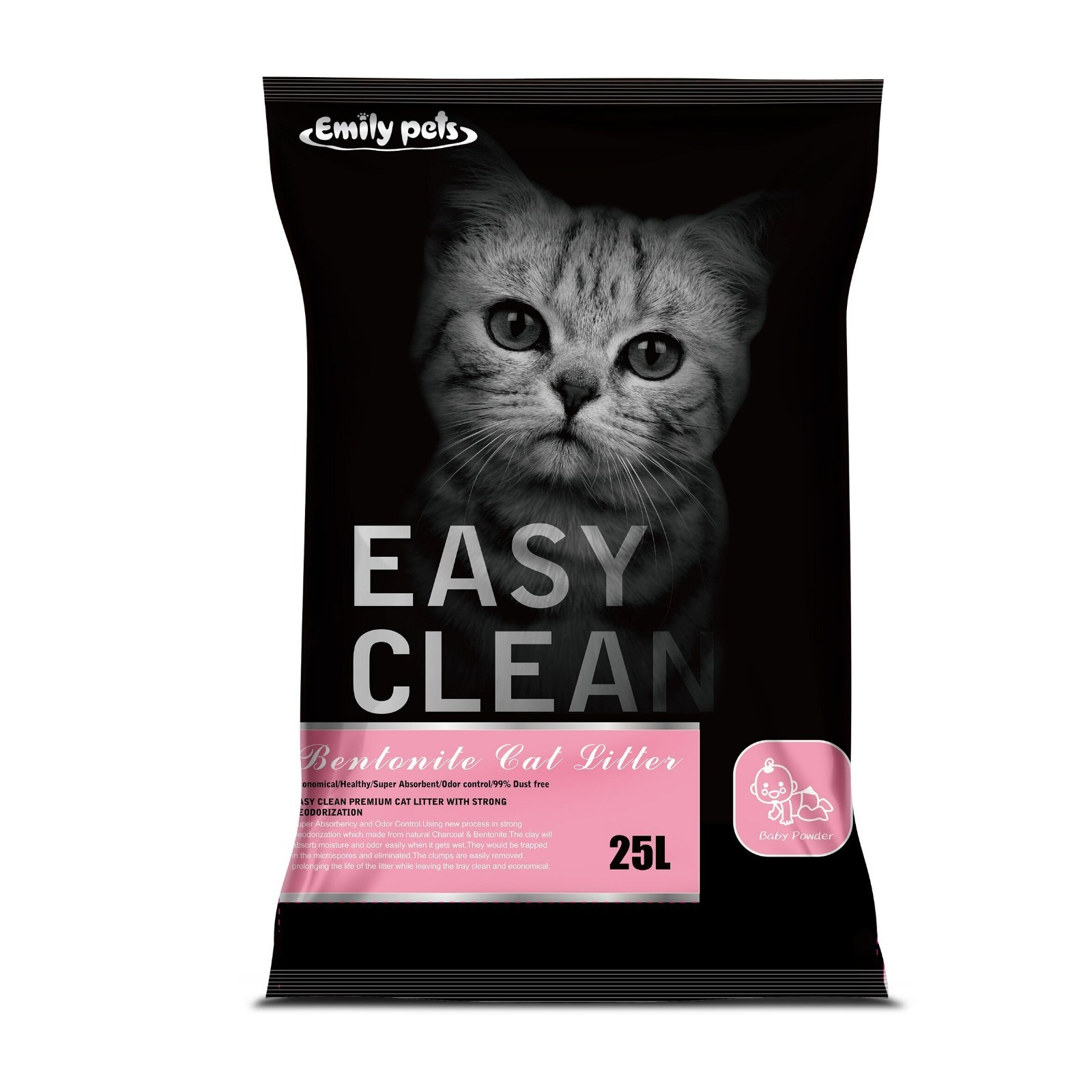 Easy Clean, es una arena sanitaria de gatos natural, sin aditivos químicos, cuyo producto principal es la bentonita, además es aglutinante, tiene reacción inmediata, es súper absorbente, sin dejar polvo en un 99%, es perfecta para el uso diario ya que elimina malos olores con sus contenidos de Talco bebé y sobre todo bacterias del arenero.